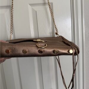 Iconic Rebecca Minkoff Mini MAC crossbody in a stunning rose gold metallic perforated leather. Features gold-tone hardware, signature chain strap with leather shoulder pad, tassel zipper pull, and protective bottom studs.