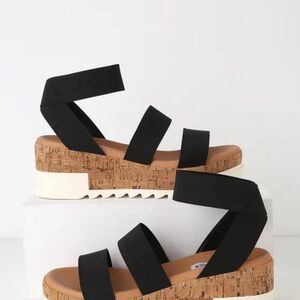 These Steve Madden sandals feature a stylish combination of black and brown straps, complemented by a comfortable platform sole. The design includes multiple horizontal straps and a secure ankle closure, making them perfect for everyday wear. The platform provides a slight elevation while ensuring a casual and contemporary look.