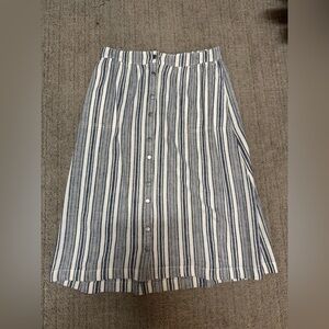 Stylish A-line skirt with blue and white stripes. Features button-down front. Perfect for casual outings.