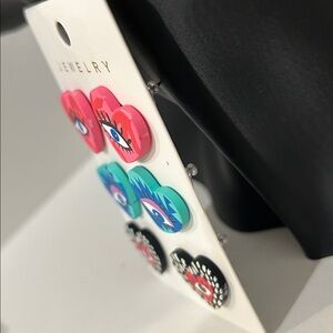 Set of heart-shaped earrings with eye design. Features vibrant red, blue, and black colors.