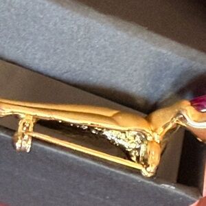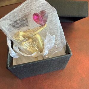 Beautiful vintage AJC signed angel brooch featuring a graceful winged angel in a seated pose with a large pink/magenta lucite heart accent. This romantic piece showcases the quality craftsmanship AJC (American Jewelry Chain) was known for during the 1980s-1990s.