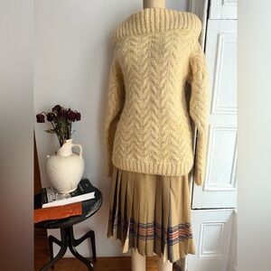 beautifully handmade heritage cable knit fisherman sweater in a warm beige tone, crafted in a dense, heavy-weight knit with traditional cable detailing throughout. Designed with a classic boat neckline and relaxed, oversized proportions, this piece reflects timeless fisherman and Aran-style knitwear traditions rooted in durability and function.