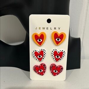 Set of heart-shaped earrings with eye design. Features red, orange, and pink colors.