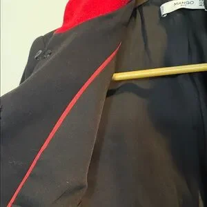 Chic black blazer with bold red trim. Features elegant gold buttons. Ideal for a stylish look.