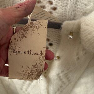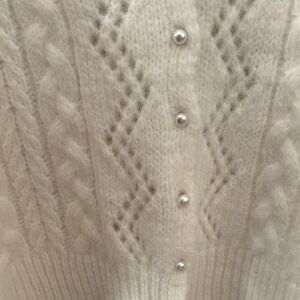 Stay cozy and stylish with this elegant white cable knit sweater. Perfect for layering, it features a classic design that complements any wardrobe. This is so beautiful with pearl buttons. Looks like a million. Warm