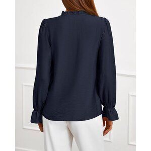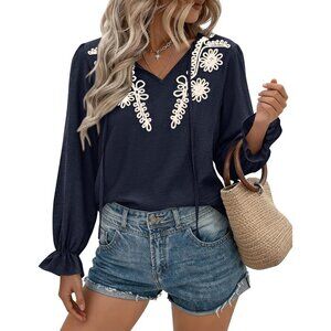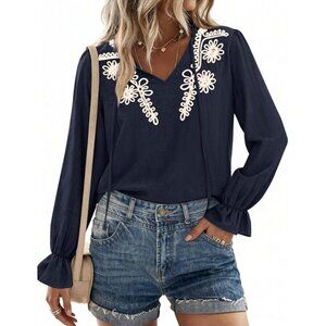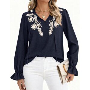 Features: Soft, breathable fabric with a delicate floral embroidery design. Features a flattering V-neck, tie-front detail that can be adjusted or left open, elastic ruffle cuffs add a charming touch. Comfortable, lightweight, and easy to style for multiple seasons.