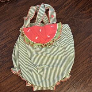 Adorable watermelon-themed kids one piece with green and pink stripes. Perfect for playful days.