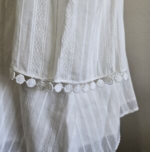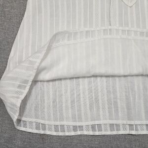 Embrace effortless, "lived-in luxury" with this stunning Maven West bohemian blouse. Rendered in a soft ivory/white hue, this top features a delicate vertical textured stripe throughout the fabric. The design is elevated by a flattering V-neckline with long, functional tassel ties and breezy cold-shoulder cutouts. The top also has a lining. The sleeves are finished with a beautiful crochet trim, adding a touch of artisan charm to this coastal-chic piece. Whether paired with denim shorts for a beach day or linen trousers for dinner, this top exudes relaxed elegance.
