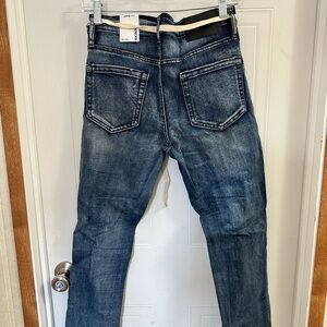Trendy skinny jeans with distressed patches. Blue denim with green and red paint splatters. Ideal for a modern style.