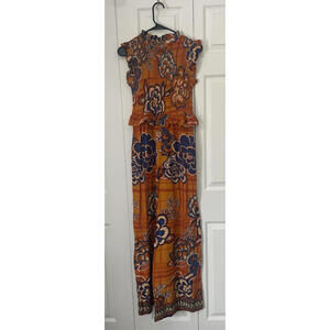 The product is a NWT $228 Farm Rio smocked wide leg jumpsuit in size XS. This one-piece outfit features a floral pattern in vibrant multicolor, perfect for women looking to make a stylish statement. The sleeveless design and smocked details add a touch of flair to the wide-leg silhouette, making it a versatile and fashionable choice for any occasion.