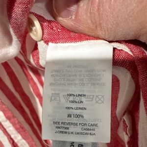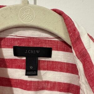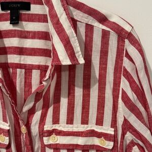 Linen button-up with bold stripes. Features dual front pockets and long sleeves.