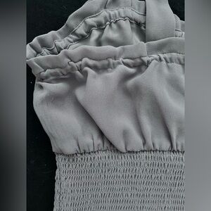 square-neck camisole with a smocked bodice, ruffled peplum trim and self-tie straps at the shoulder. It’s made from lightweight, semi-sheer chiffon. This version comes printed with a hand-done woodblock pattern that was created in house