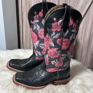 Stylish Ariat cowboy boots with floral design. Black leather with pink rose accents. Perfect for a bold look.