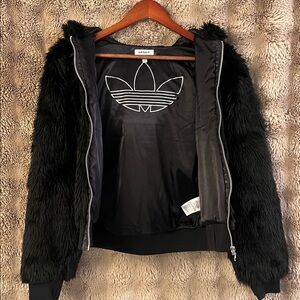 Stylish black faux fur varsity jacket. Features iconic adidas logo inside. Perfect for a chic look.
