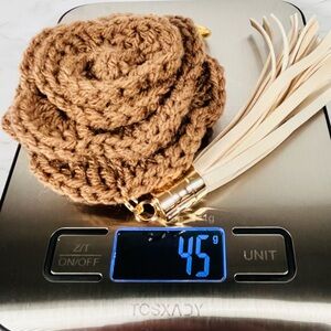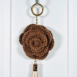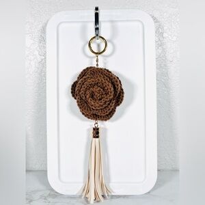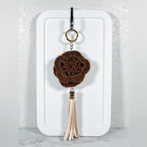 Elegant hand crafted brown crochet flower bag charm with tassel and gold ring. Perfect accessory for adding a touch of style to your keys or bag.