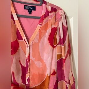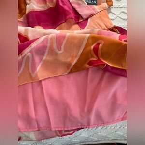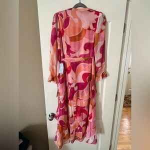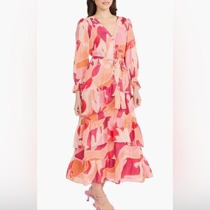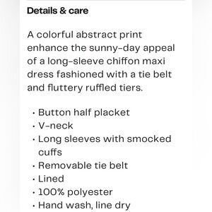 NWT! Brand new! Beautiful. Long-sleeve chiffon maxi dress with a colorful abstract print. Features a tie belt and ruffled tiers. More info and measurements in photos. Smoke free home. Polyester. Sheet long sleeves. Optional tie belt. Women’s size 2.
