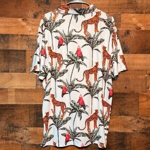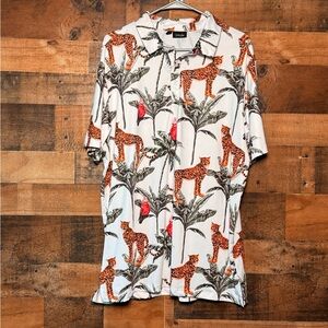 New without tags and never been worn. Sports Buff men's white golf polo shirt. Jungle/leopard print, short sleeve and size XL. Brand new.