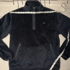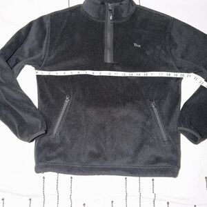 In excellent condition. Stay warm and stylish with this black polar fleece sweater. Perfect for any casual outing. High neck, two pockets with zippers, and adjustable straps at hem. Please reach out for more information.