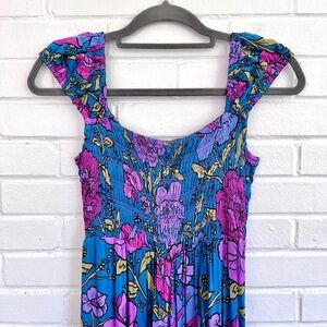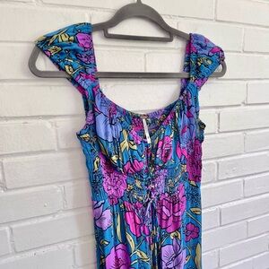 This Free People “Rolling Hills” jumpsuit is a stylish one-piece garment known for its relaxed fit, wide-leg silhouette, and vibrant floral print. It features a deep V-neck, cute sleeves, and a deep squared open back. The jumpsuit is designed for comfortable wear with its flowy, wide legs 🤍