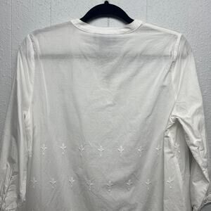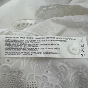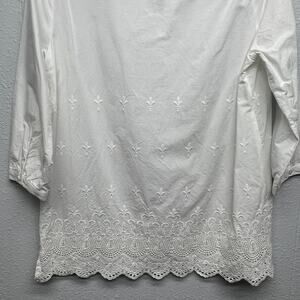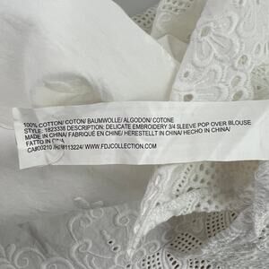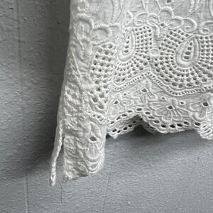 FDJ women's white top. V-neck. 3/4 sleeves. Embroidered bodice. Crochet bottom hem with side slits. In good used condition. Has one small spot near the hem, please see last picture. Not extremely visible. In good used condition. No tears or holes.