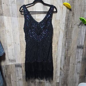 Details: stretchy, sleeveless, lined, zip side, beaded and sequined throughout, v neck, fringe bottom, about knee length, very sexy and fun