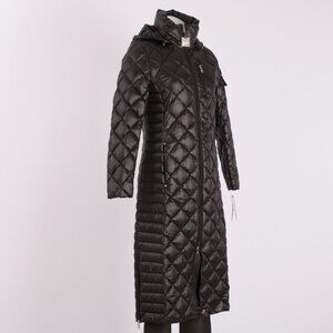 This Lauren Ralph Lauren long puffer coat features a sleek black shell with diamond quilting and a streamlined, body following silhouette. It is insulated with 90% duck down and 10% feather fill and includes a manufacturer cold weather rating of 7°F to 50°F, making it suitable for winter climates and transitional cold days. The design includes an attached hood, high stand collar, full front zip closure, zippered side vents at the hem for ease of movement, and multiple zip pockets plus a chest pocket finished with logo snap hardware and a tonal RL patch. A subtle sheen gives the coat a polished outerwear look that works well with workwear, travel outfits, or everyday winter layering.