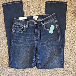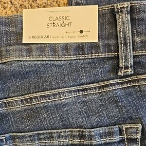 Stylish straight leg jeans. Classic dark blue denim. Features back pocket stitching.
