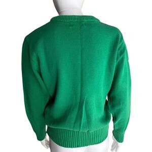 Vintage Lands’ End ladies cotton knit sweater featuring a classic crewneck silhouette and bold horizontal stripe detail across the chest. Rich green base with blue, white, and red striping gives this piece an iconic preppy, collegiate, and 90s throwback look. Medium-weight knit with ribbed cuffs, hem, and neckline for structure and durability.