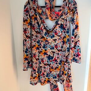 Chic dress with vibrant floral patterns. Blurred paisley velvet fabric with a crossover chiffon halter and cowl neckline. Has an invisible zip closure with back chiffon ties. Super unique design and elegant style.