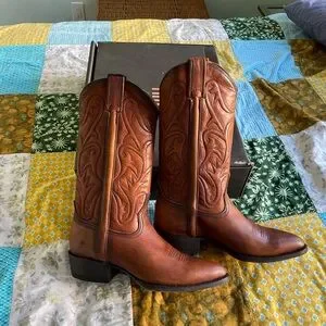 Pristine cognac leather cowboy boots with intricate stitching. Classic Western style by Frye. Frye Bruce. Never worn.