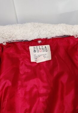 Stay cozy and stylish with this unique Billabong wool-blend cape coat. This eye-catching piece features a classic black and white plaid pattern with subtle red accents, a plush cream-colored sherpa collar for added warmth, and a distinctive faux-leather buckle front closure. The red satin-like lining adds a hidden pop of luxury, making it perfect for fall adventures or winter layering.