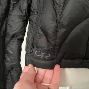 Outdoor Research Women's Aria Hoody Black Down Filled Packable Puffer Jacket XS. The ultralight Outdoor Research Aria Down Hoody™ is filled with 650 fill down insulation to provide extremely compressible warmth, making it a favorite of OR's women testers. Pull up the OR Aria’s hood when the sun sinks or stash the hoody away when the temperature rises. A trim fit makes this backcountry beauty the perfect insulation piece for mountain travel, but it's still trendy enough to wear around town. Excellent condition.