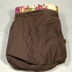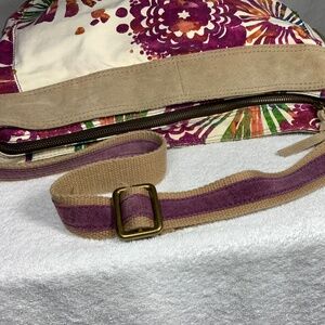 Top zip opening. Inside is very roomy with brown cloth lining with zippered pocket and 2 slip pockets