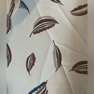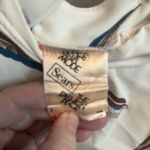 Vintage blouse. Fall vibes with leaves falling in browns and pops of navy. Bodice overlay. Fun high mock neck. Buttons up the back. Vintage sears. Very lady went to the office in houses like this through the 70s. Sizing is vintage please refer to measurements