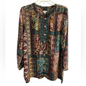 Stylish tunic with intricate patchwork design. Features a mix of vibrant colors. Ideal for casual wear.