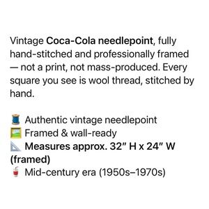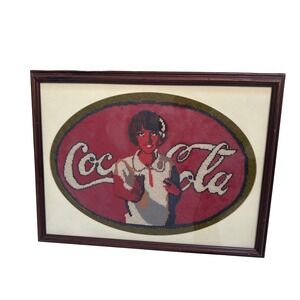 Keywords: Coca Cola, needlepoint, vintage art, hand stitched, mid century, retro, wall hanging, collectible, advertising, americana, framed art, textile art
