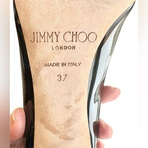 Jimmy Choo black patent leather pumps with 4 inch stiletto heels, excellent preloved condition, only worn two times, look new. One scuff on the inside lower instep, see pictures, you don’t see it at all when standing in the shoe. Each shoe has its own original dust bag. All the shiny spots in the pictures are reflections of my ceiling lights. They really do look pristine. Sleek and stylish glossy black heels. Perfect for a chic look.