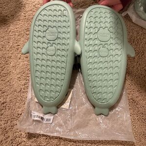 Fun shark design slippers in mint green. Perfect for casual wear.
