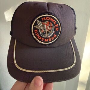 Howler Brothers hat, Howler Brothers trucker hat, Howler Brothers snapback, brown trucker hat, vintage style trucker hat, embroidered patch hat, eagle patch hat, outdoor lifestyle hat, heritage workwear cap, rugged workwear hat, gorpcore hat, granola style cap, outdoorsman hat, fishing hat style, western inspired hat, Americana style cap, patina trucker hat, distressed look hat, classic trucker cap, adventure core, utility wear accessories, casual streetwear hat, menswear inspired cap, unisex trucker hat, earth tone hat, brown canvas hat, surf western style, Texas brand hat, lifestyle brand cap,
