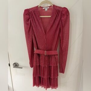 Elegant pink mini dress with long sleeves. Features a deep V-neckline and layered skirt. Perfect for a night out. Never wore.