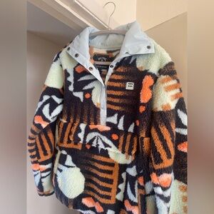 Cute Billabong pullover with front pocket holder. Can be worn snapped up for colder days. Size small. My son got it for me for Christmas but I like a more oversized fit. It’s a small. Only wore once. Great condition. Has lots of wears left.