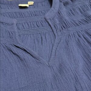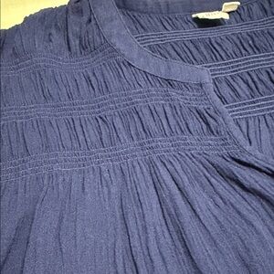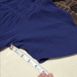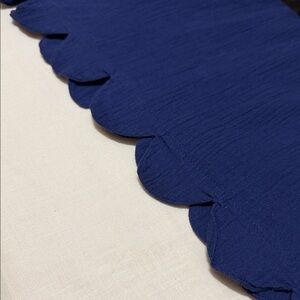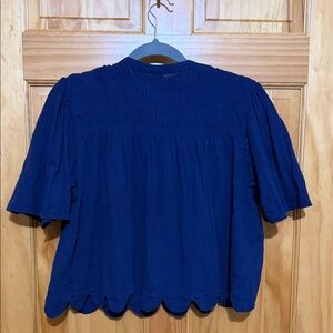 Boho inspired blue blouse with scalloped hem. Features short sleeves and textured sloughed cotton fabric. Cropped and boxy fit. Good pre owned condition. See photos for measurements to ensure proper fit.