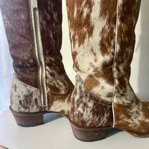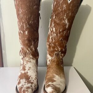 Handcrafted auburn and white cowhide boots. Lane boots are carefully crafted in Mexico and the artisanal leather work makes every boot one of a kind, no two boots are alike! Boots are gently worn, the leather bottoms have been worn outside.