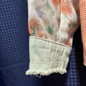 Stylish colorblock design. Features green and orange tones. Floral accents on sleeves. Button-up front. Perfect for casual wear.