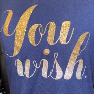 Navy blue pajama top with long sleeves. Features 'You Wish' in gold and silver lettering.