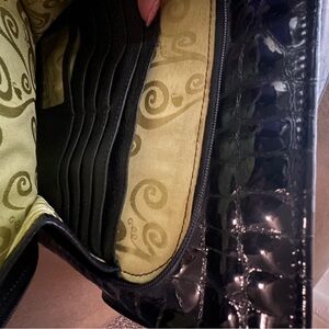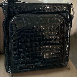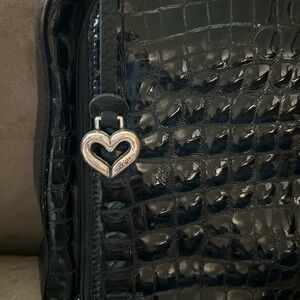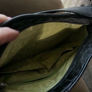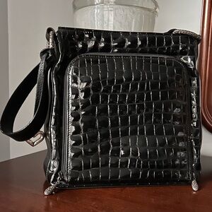 Brighton shoulder bag Crocodile embossed black with silver hardware. This bag has so many great places to keep your cards, cash, phone and more. The front of the bag has a zipper pocket with card holders. There’s a Key fob in the main part of the bag with additional storage.