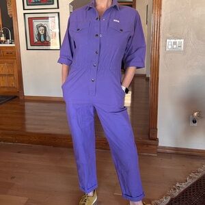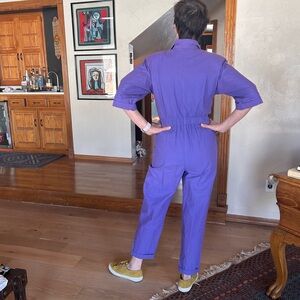 Real-deal 1980s vintage jumpsuit with a bold purple punch and serious attitude. Structured utility/workwear silhouette, snap-button front, functional pockets, and an elastic waist that actually gives shape without trying too hard.