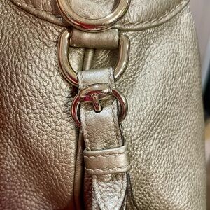 This elegant pre-loved metallic shoulder bag is perfect for any occasion. Its sleek design and stylish tassel accents make it a must-have accessory. The metallic color adds a touch of sophistication to your outfit. Missing the crossbody strap.