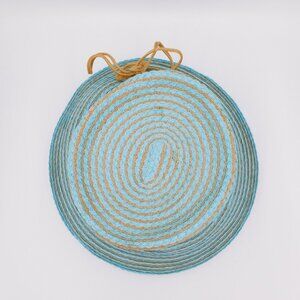 Eric Javits teal blue and brown straw wide brim hat. Water-repellent fabrication. Perfect for the beach, pool or cruise. A unique color way that will definitely stand out from the crowd. 4" brim, 8" back to from head area. Quiet luxury. Flaws: the bow in the back is a little wonky and curls a lot and some indentation from improper storage. In good used condition.