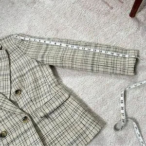 Like new cotton blend tan blazer with navy blue plaid accent.